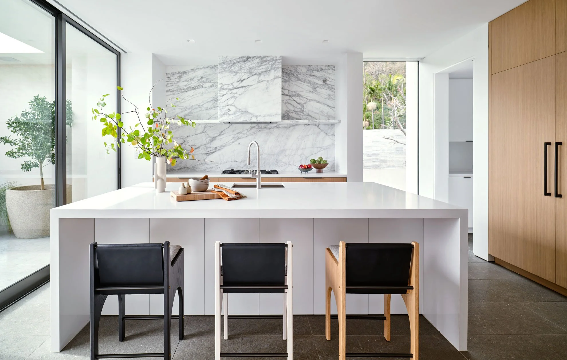Floor-to-ceiling glass walls effortlessly slide open, blending indoor living spaces with a lush, luxurious outdoor haven. The hillside residence is designed to harmonize privacy with tranquility.