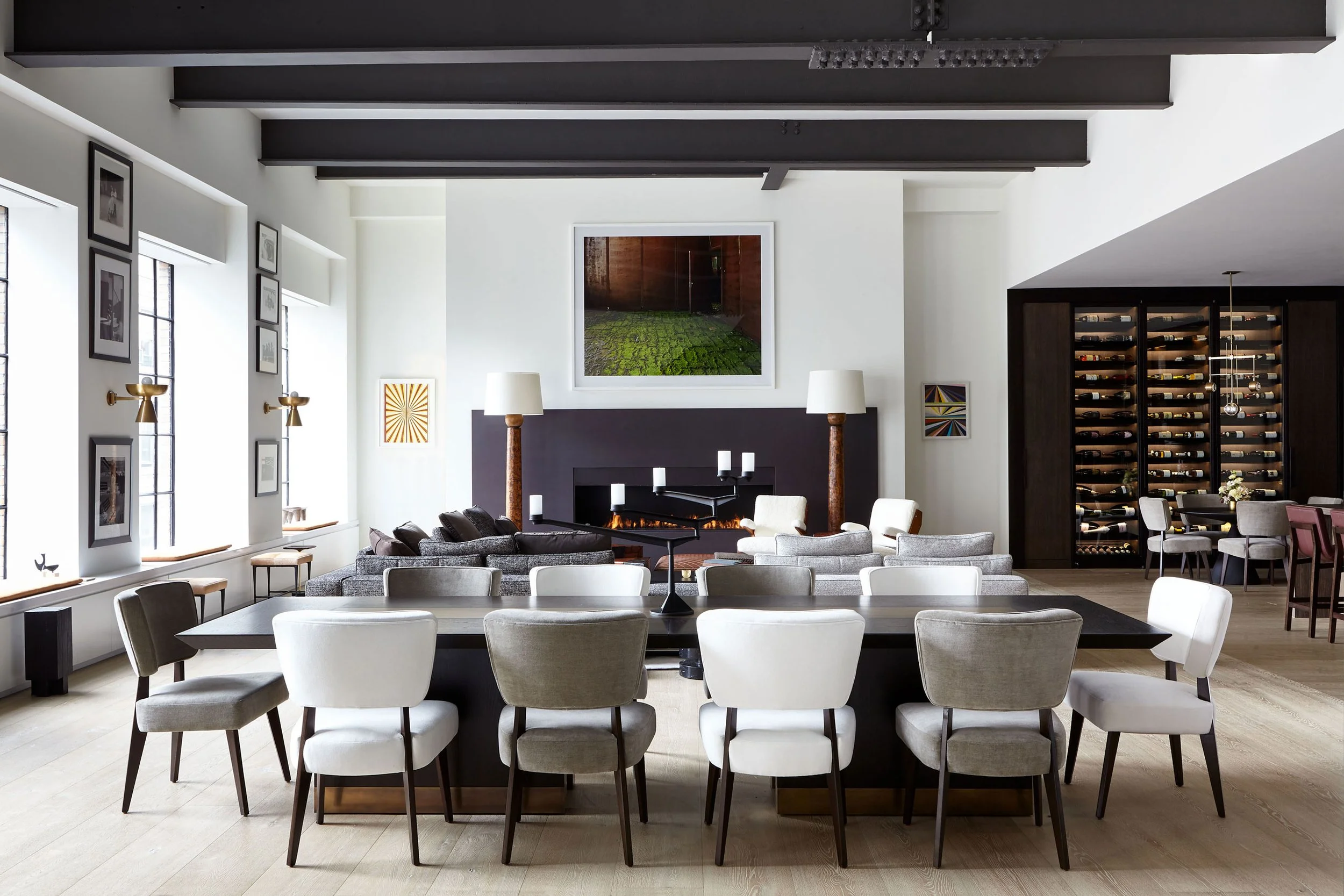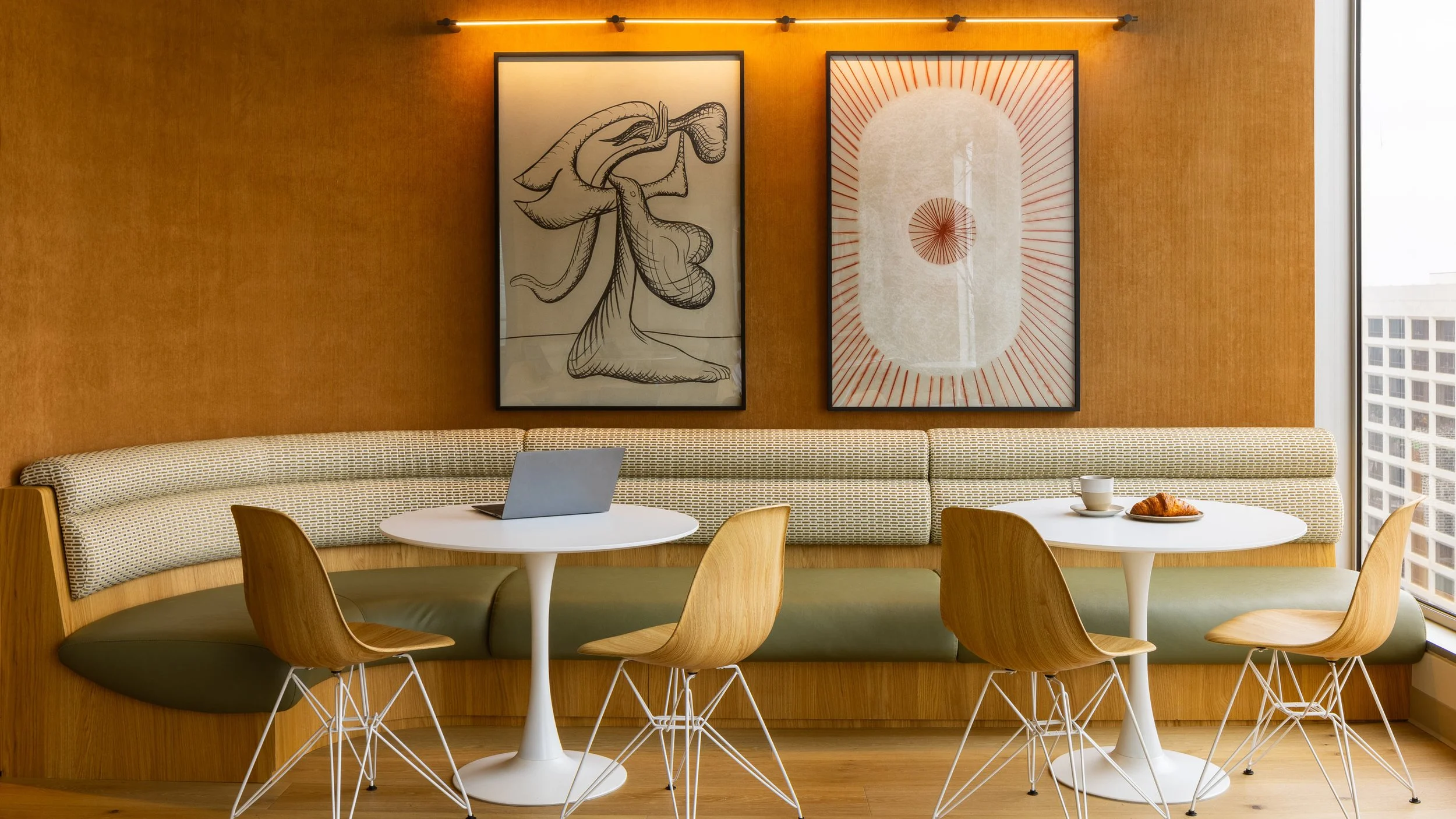 A central avenue anchors the design, seamlessly connecting communal areas such as a grand conference room and a bespoke café featuring custom banquette seating.